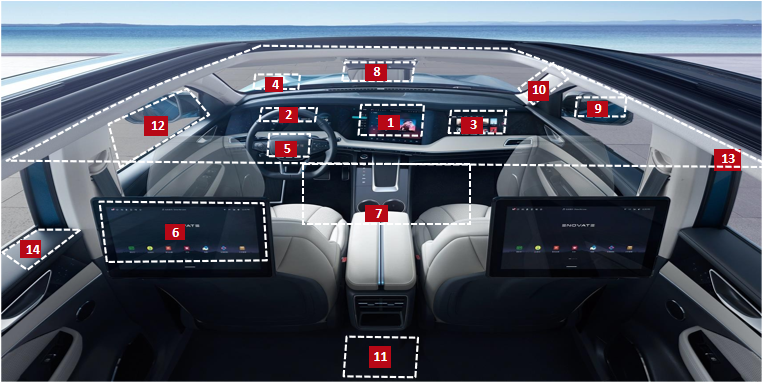 除上述三屏外,后艙的娛樂、CMS、A柱、扶手屏,包括將來的車窗顯示,天幕顯示等,車里的屏會越來越多,并逐漸連到一起,實現車載屏顯的“無界化”設計,帶來更好的人車交互體驗。