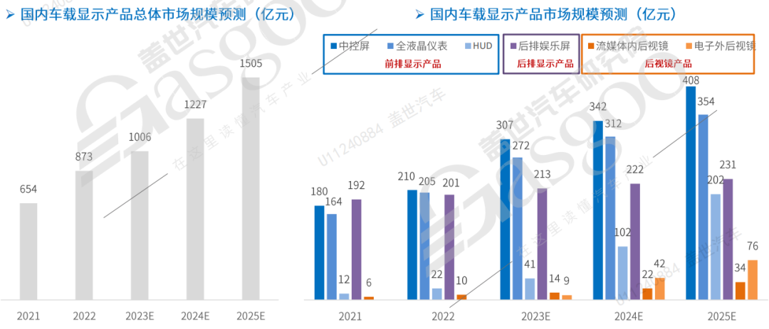 據蓋世汽車研究院統計,隨著車載顯示技術不斷迭代升級與滲透,預計到2025年國內車載顯示市場將突破1505億元。其中中控屏、全液晶儀表、HUD 、后排娛樂屏、流媒體后視鏡、CMS的國內市場將分別達到408、354、202、231、34、76億元。